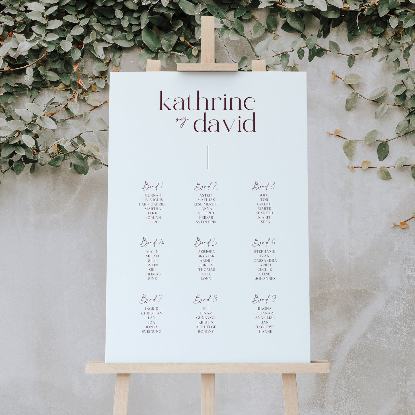 Et bordkart gir gjestene muligheten til å finne sitteplassene sine på en enkel og oversiktlig måte. Bordkartet kommer i en størrelse på 50x70 cm (plakatstørrelse) og er printet på tykk Kapa-plate som kan settes på staffeli eller lignende.