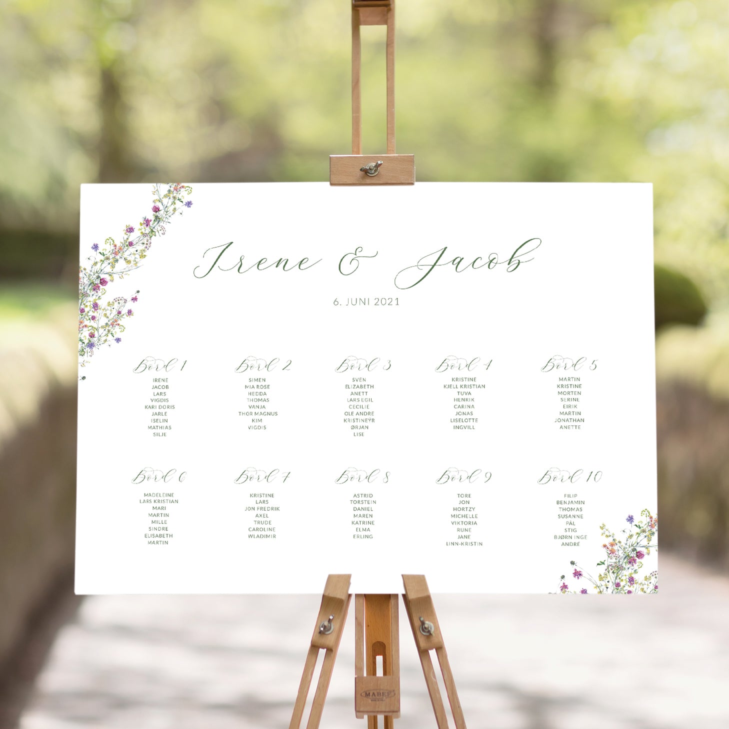 Et bordkart gir gjestene muligheten til å finne sitteplassene sine på en enkel og oversiktlig måte. Leveres som en sammenrullet plakat.