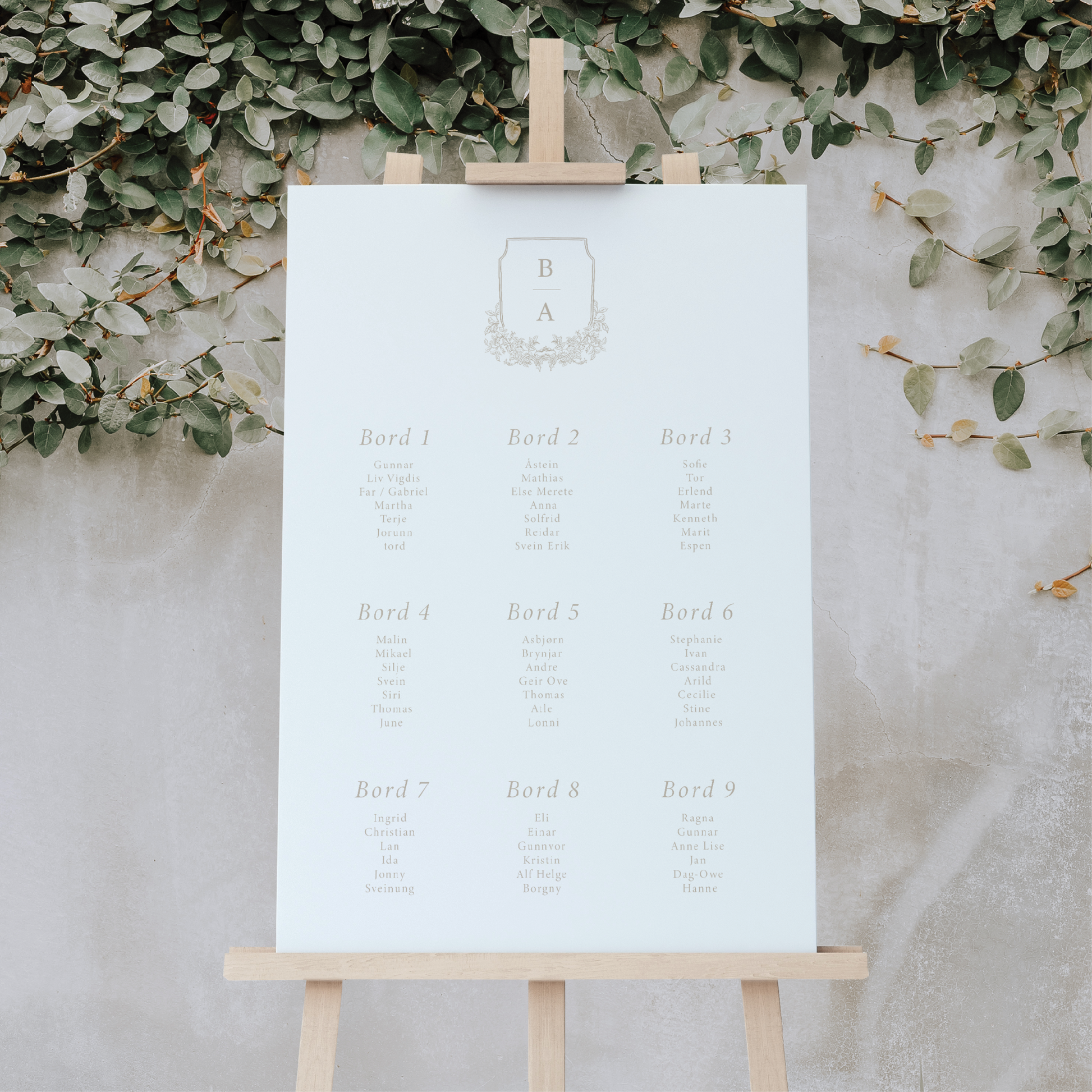 Et bordkart gir gjestene muligheten til å finne sitteplassene sine på en enkel og oversiktlig måte. Bordkartet kommer i en størrelse på 50x70 cm (plakatstørrelse) og er printet på tykk Kapa-plate som kan settes på staffeli eller hengende.