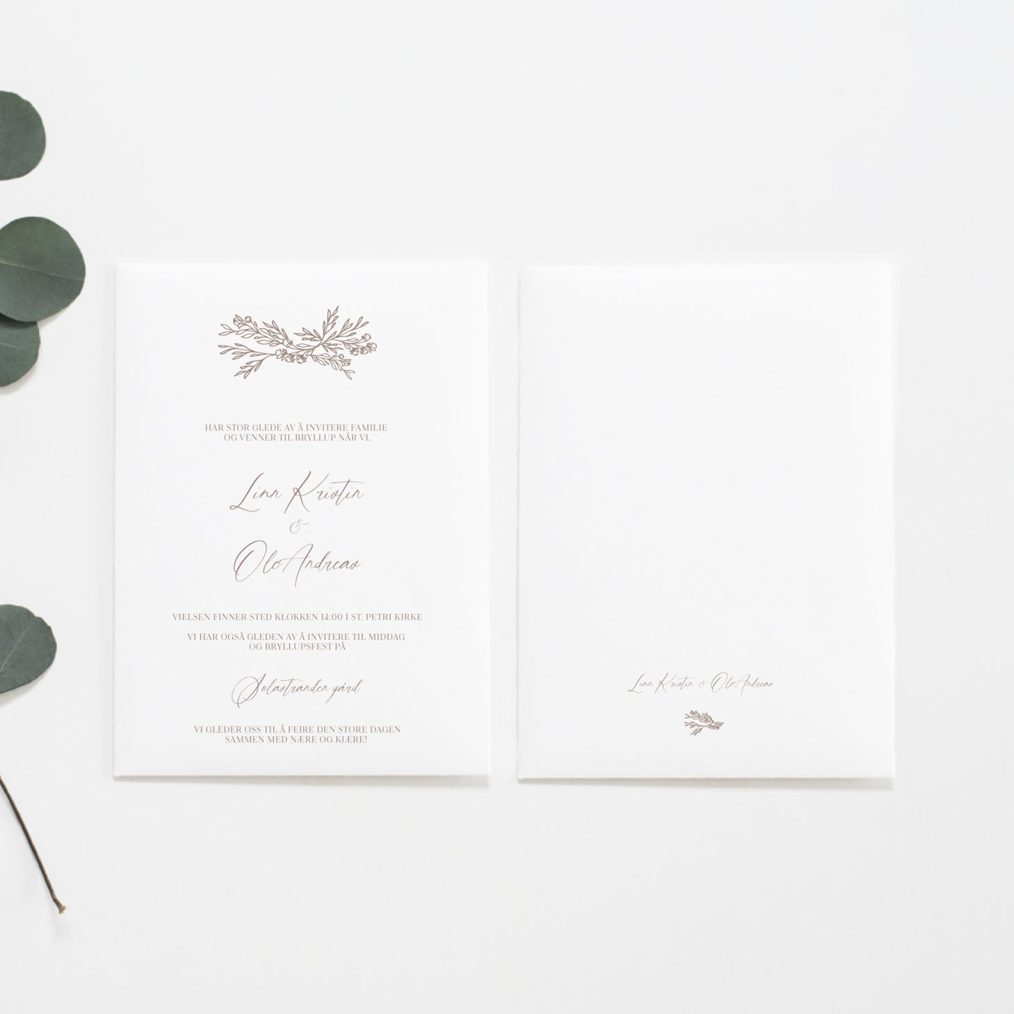 Bildet viser framsiden og baksiden av invitasjonen. Har du mye informasjon som skal med, anbefaler vi å bestille infokort i tillegg.