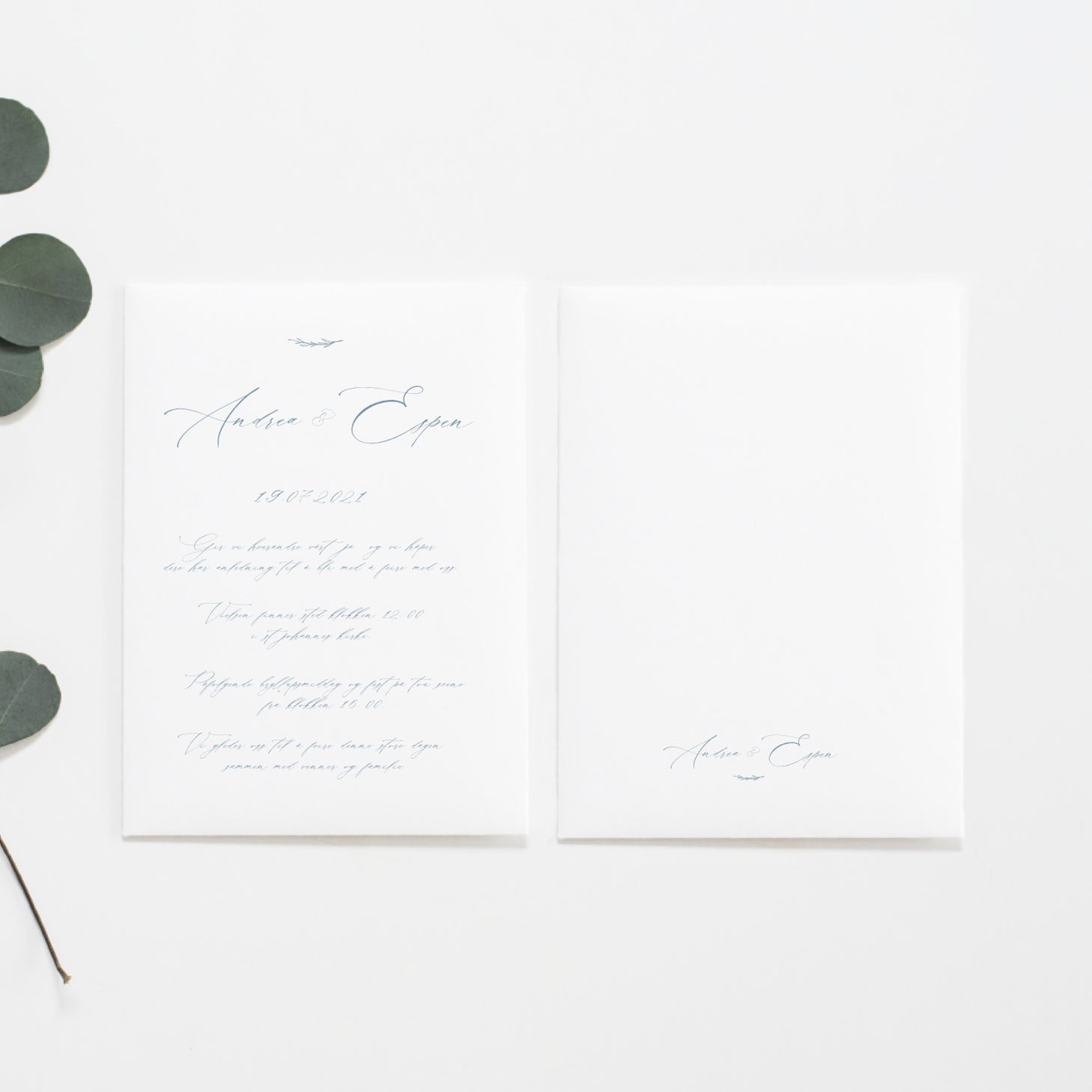 Bildet viser framsiden og baksiden av invitasjonen. Har du mye informasjon som skal med, anbefaler vi å bestille infokort i tillegg.