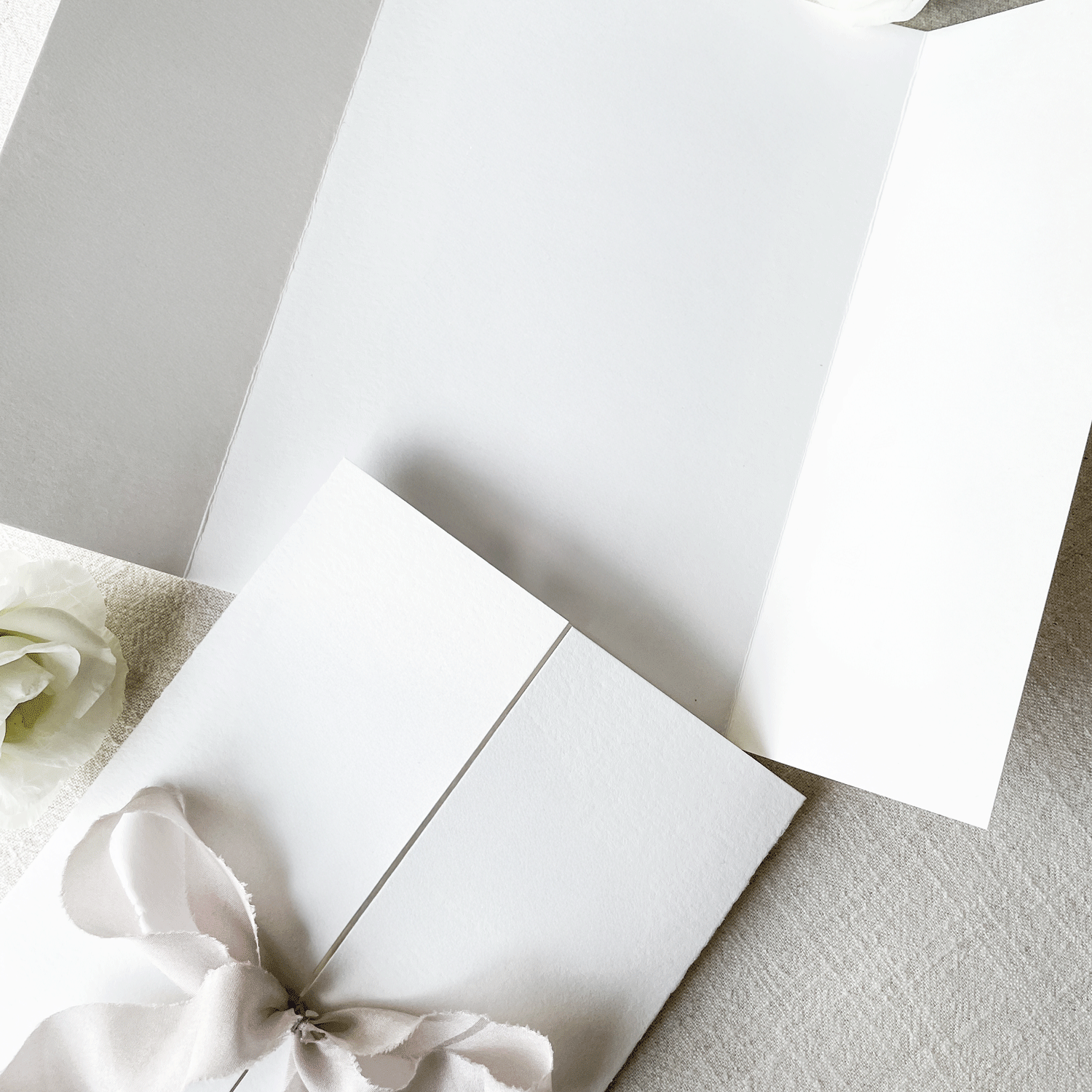 - Gatefold: foldet invitasjon med plass til invitasjonstekst, detaljer og program. En dyrere variant, men et rimeligere alternativ til infokort og programkort. Ved valg av gatefold tilpasses designet dette formatet. NB. Sløyfebånd følger ikke automatisk med og må bestilles for seg.