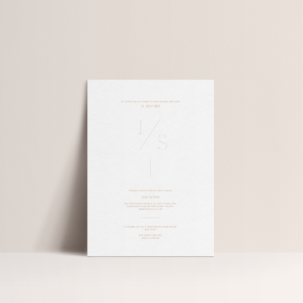 Velg om du ønsker blomsten i midten av invitasjonen med eller uten gullfoliering. Velger du uten, kommer denne printet i vanlig blekk som oppleves som fargen, Gull.