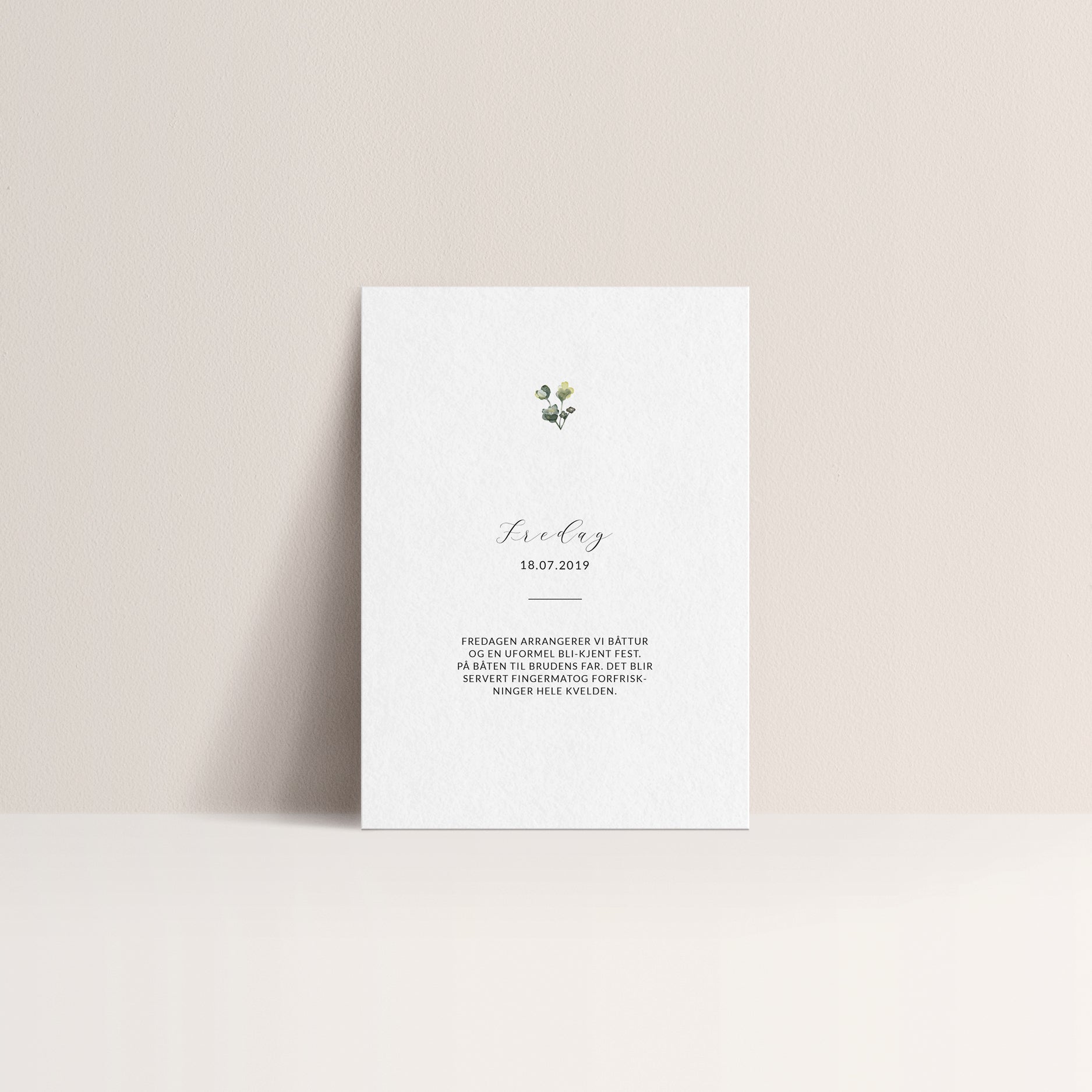 Infokort er en fin måte å gi den informasjonen du ønsker å formidle til de inviterte. Typisk innhold kan være program for dagen/helgen, praktisk informasjon, informasjon om overnatting og informasjon om reiserute.