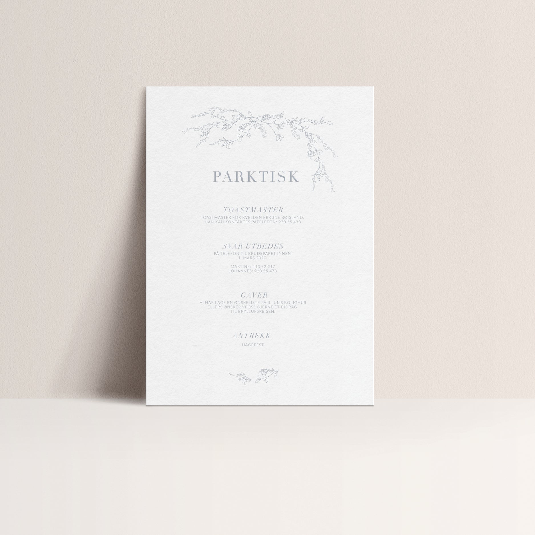 Infokort er en fin måte å gi den informasjonen du ønsker å formidle til de inviterte. Typisk innhold kan være program for dagen/helgen, praktisk informasjon, informasjon om overnatting og informasjon om reiserute.