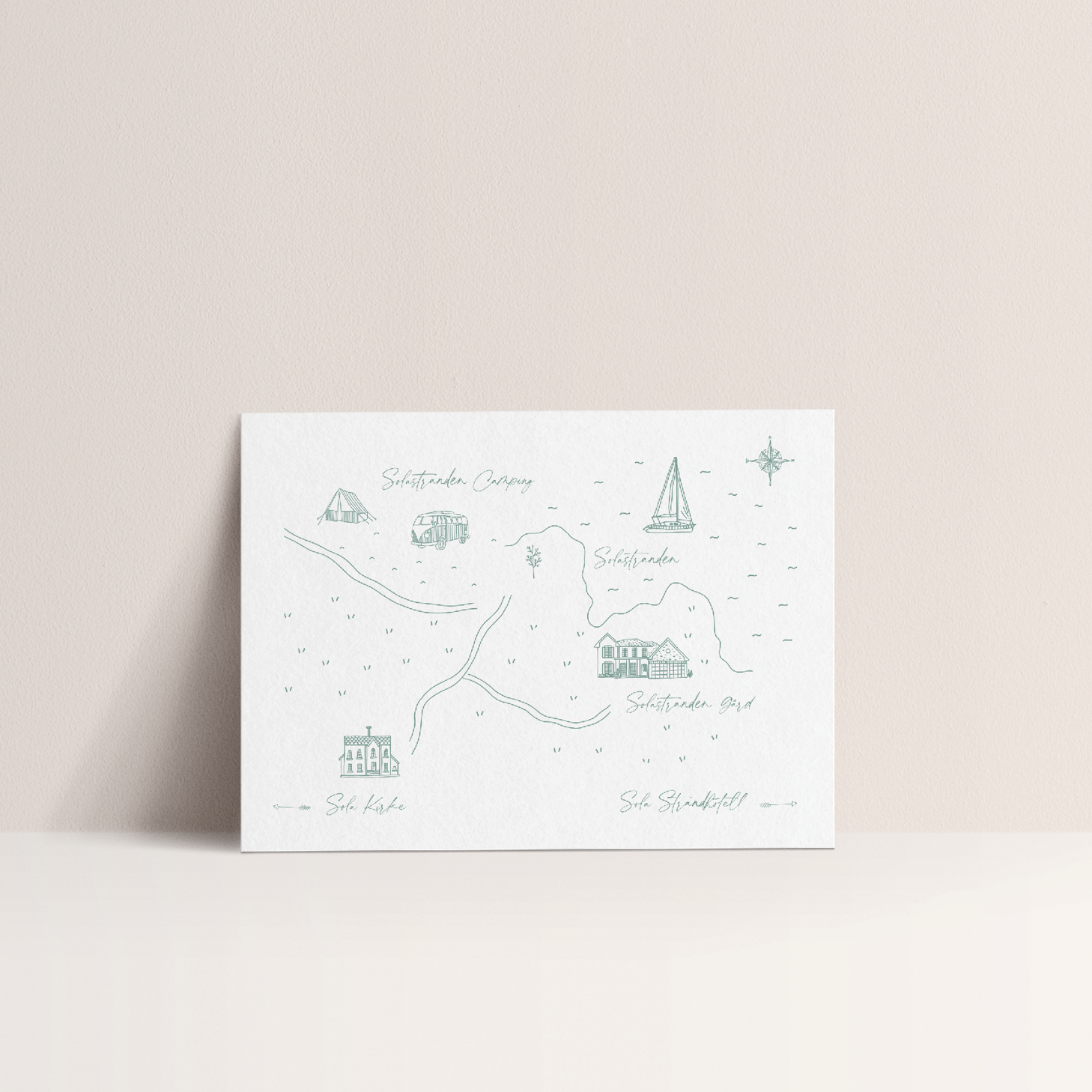 Kart over området hvor bryllupet holdes er en fin detalj til invitasjonene deres og gir gjestene en god oversikt til hvor alle lokasjoner er. Som kirke, festlokale, overnattingsmuligheter osv.