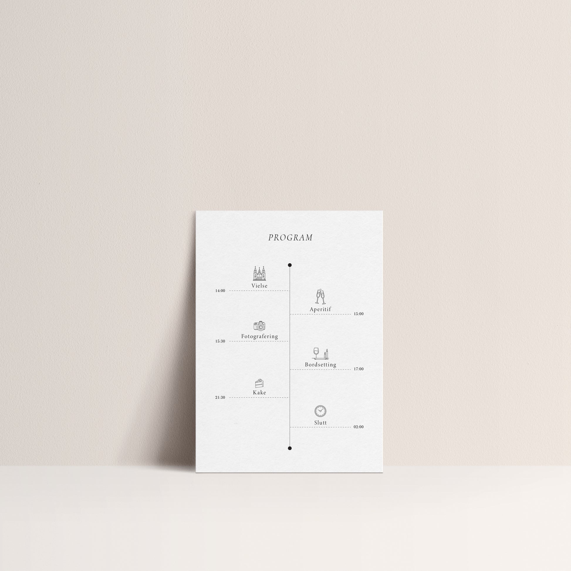 Programkort som viser agendaen for den store dagen deres. Kan enten legges ved invitasjonene eller deles ut på selve bryllupsdagen.