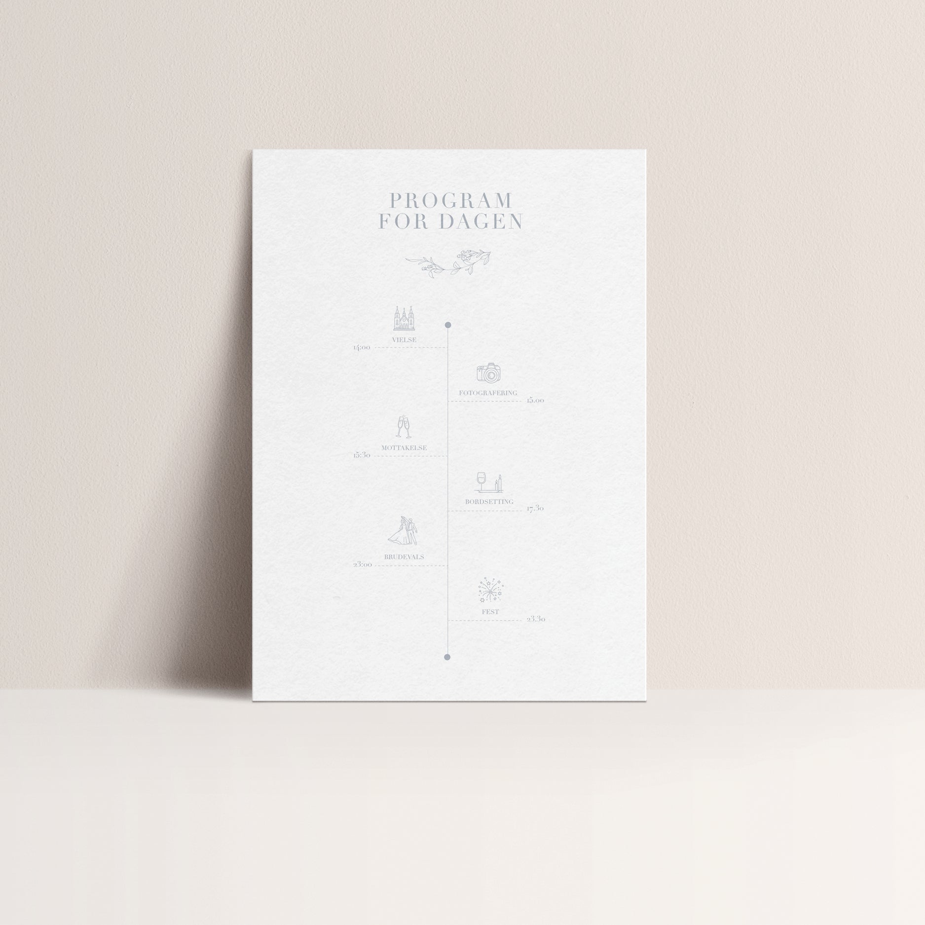 Programkort som viser agendaen for den store dagen deres. Kan enten legges ved invitasjonene eller deles ut på selve bryllupsdagen.