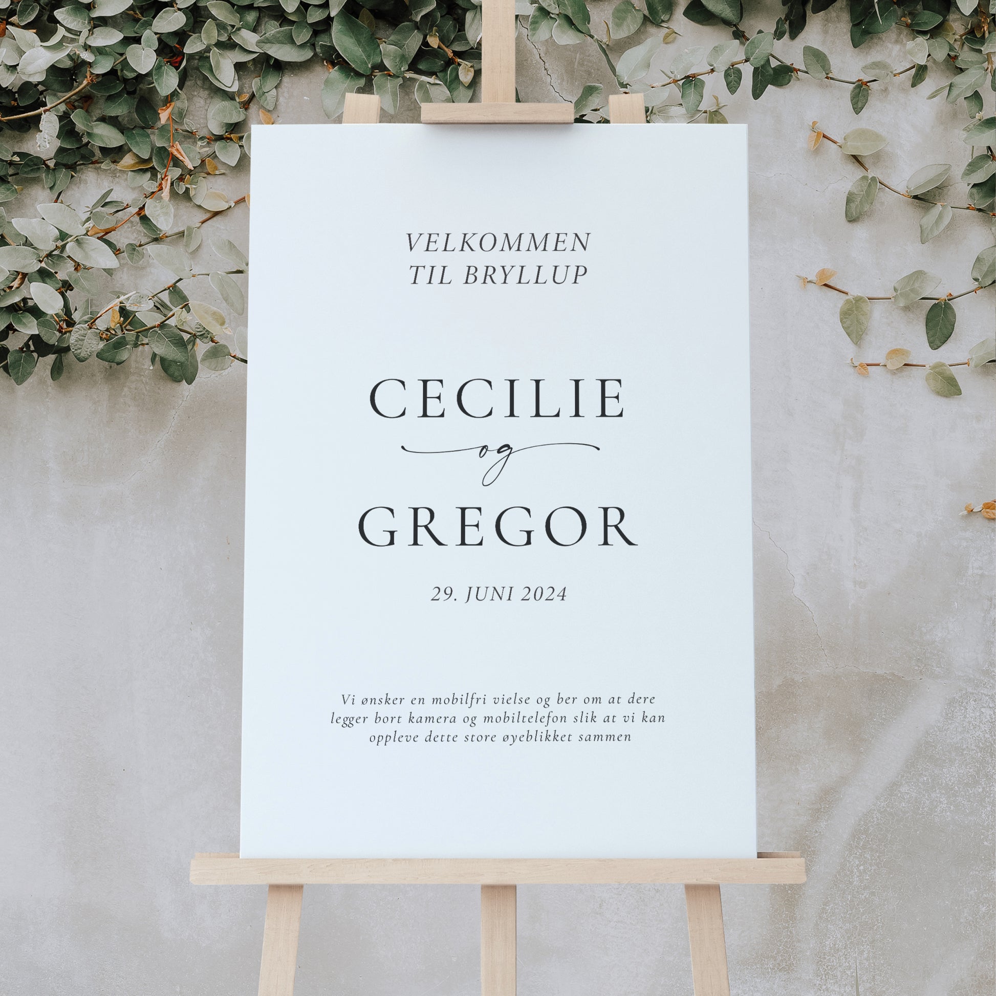 Kombiner velkomstskilt med bordkartog bordnummer i samme stil og få det perfekte uttrykket.