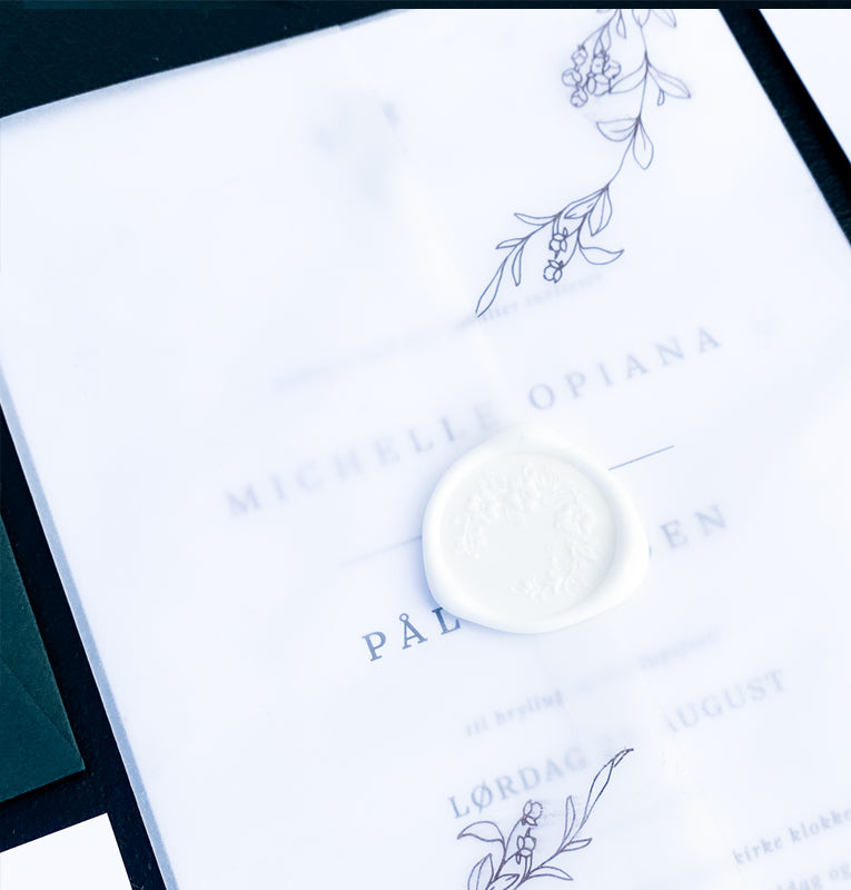 Vellum wrap er den lille detaljen som gir et soft og eksklusivt uttrykk til invitasjonene dine. Det gjennomsiktige papiret som brettes rundt invitasjonene.festes enten med silkebånd eller et av våre selvklebende vokssegl.