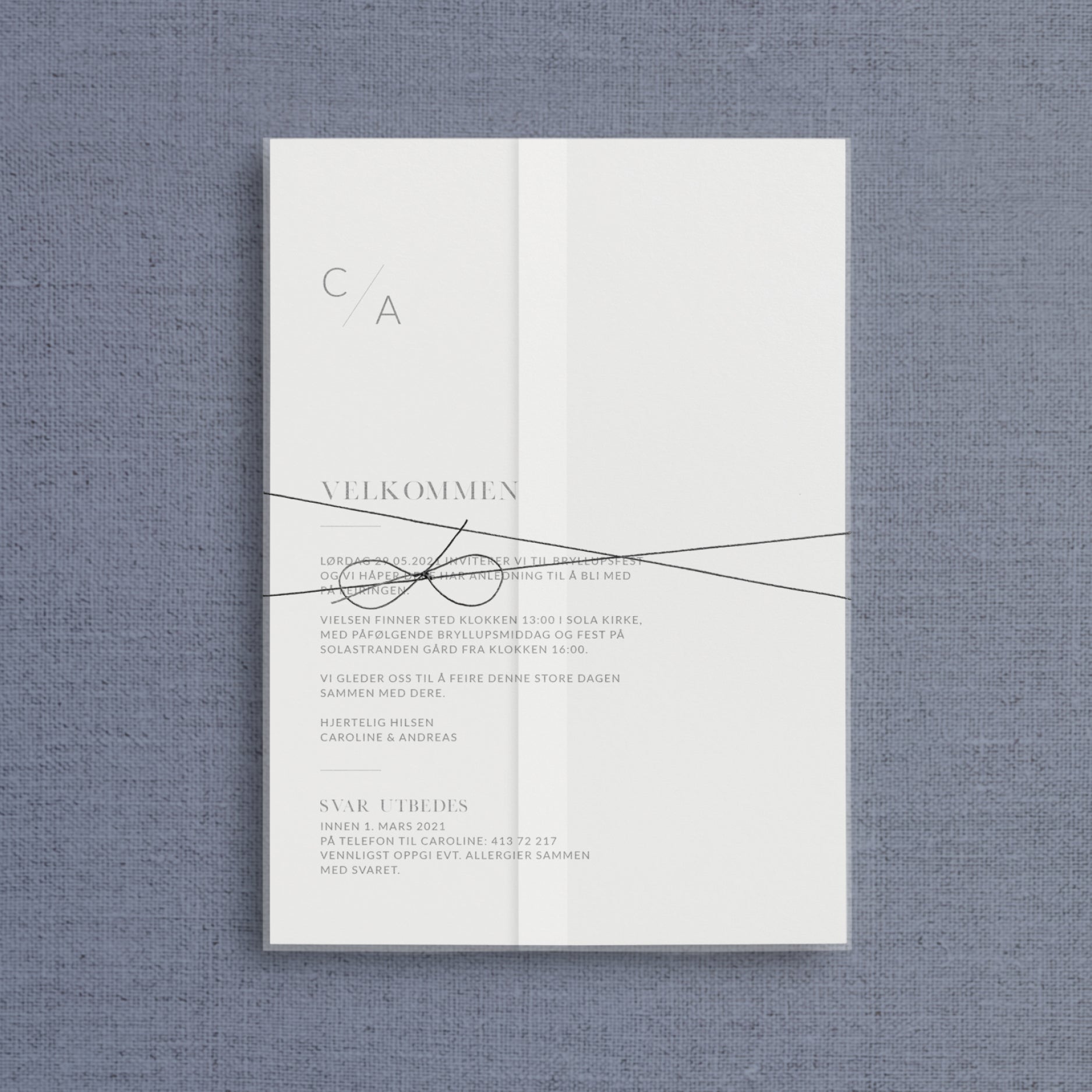 Vellum Wrap er en tynt, gjennomsiktig papir med print på, som "wrapes" rundt invitasjonene. Dette gir et eksklusivt uttrykk og tilfører det lille ekstra til invitasjonene deres.