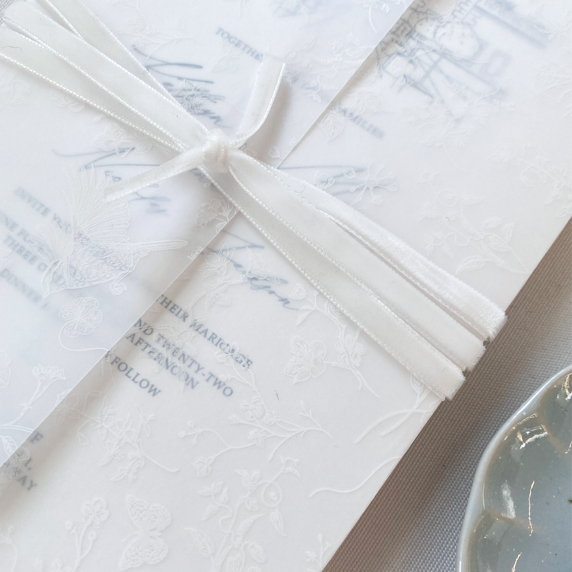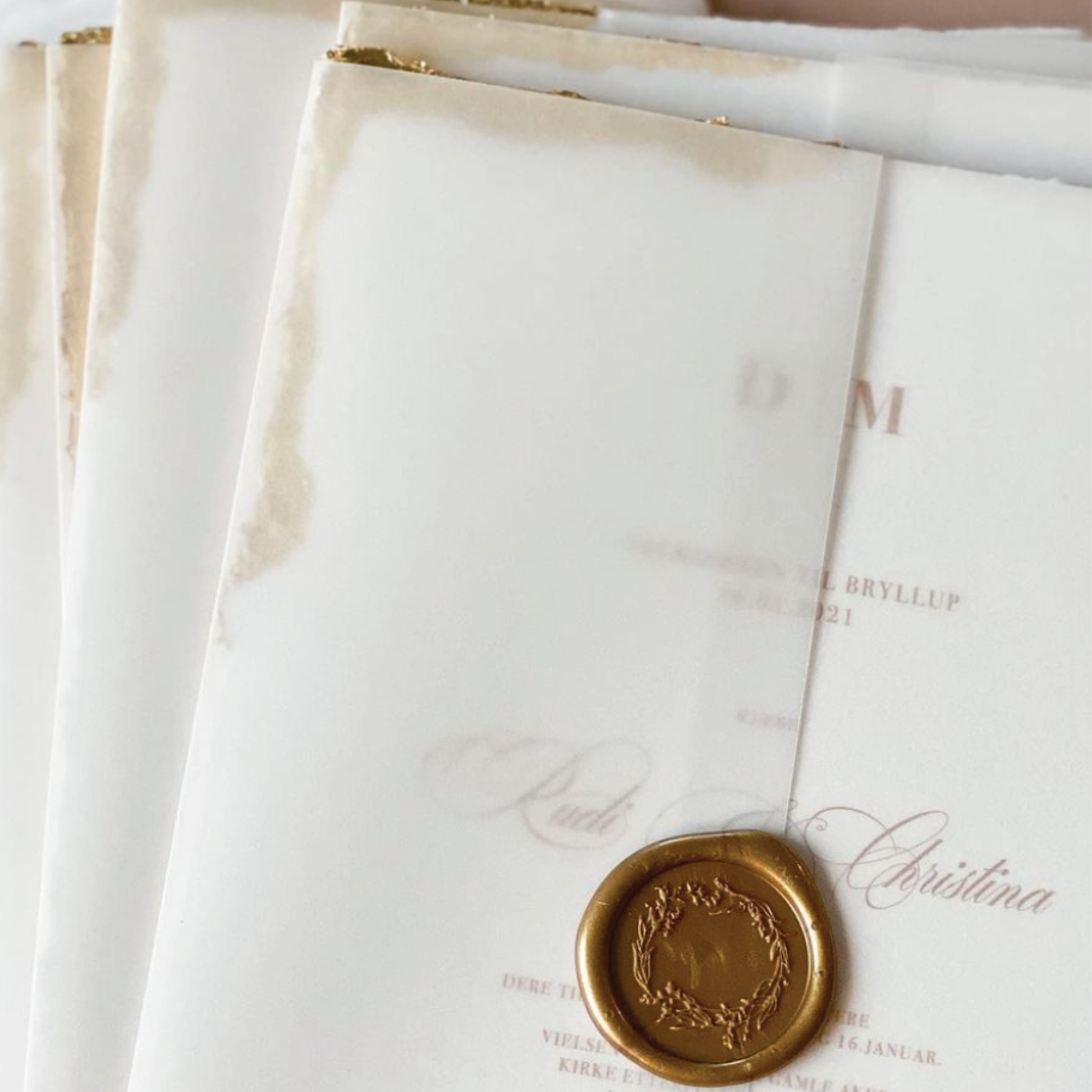 Vellumomslag er et tynt, gjennomsiktig papir som brettes rundt invitasjonene.