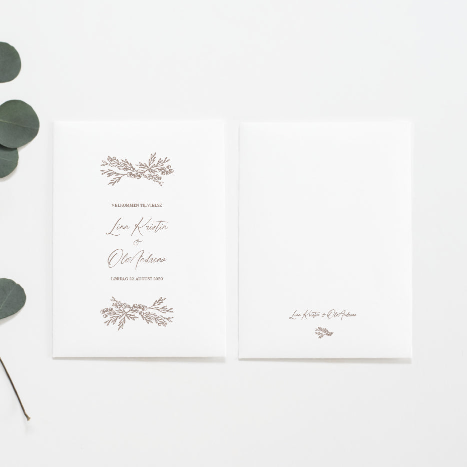 NB! Bildet viser forsiden og baksiden av vielsesprogrammet Vi sender korrektur til godkjenning før bestillingen går i produksjon.